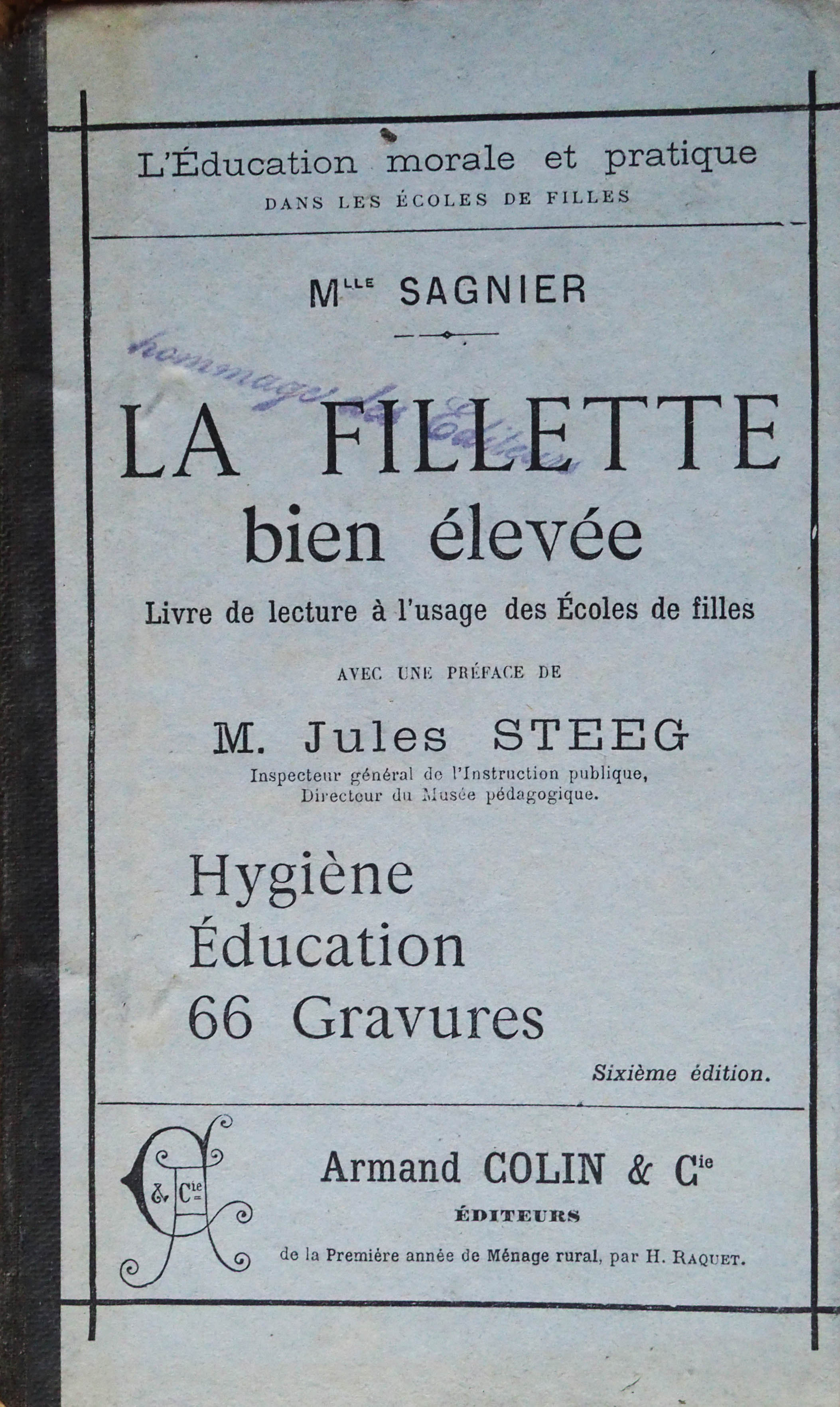 SAGNIER mlle, officier d'académie, directrice d'école normale, professeur à l'école Edgar-Quinet, STEEG (Jules), inspecteur général de l'Instruction publique, directeur du Musée pédagogique (préface)., “La fillette bien élevée. Livre de lecture à l'usage des écoles de filles.,” Maison Historique de l'Ecole dans la Manche, consulté le 28 avril 2026, https://rs-genea.com/omeka/items/show/1404.