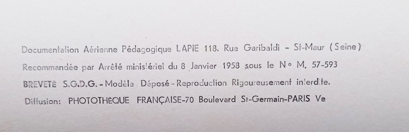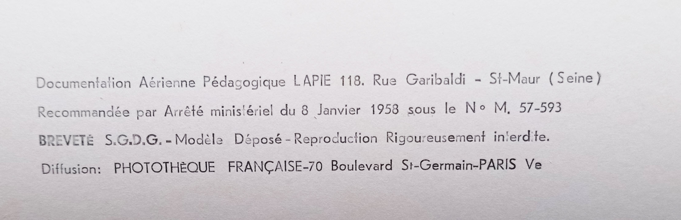 collection recommandée par arrêté ministériel du 8 janvier 1958 sous le n° M-57-593. La Société d'exploitation de la photographie aérienne Roger Lapie a été créée en 1950. Le siège de cette société, aussi dénommée Documentation aérienne pédagogique Lapie, était situé 118, rue Garibaldi, à St-Maur (Seine). Collection recommandée par Arrêté ministériel du 8 janvier 1958 sous le n° M. 57-593.