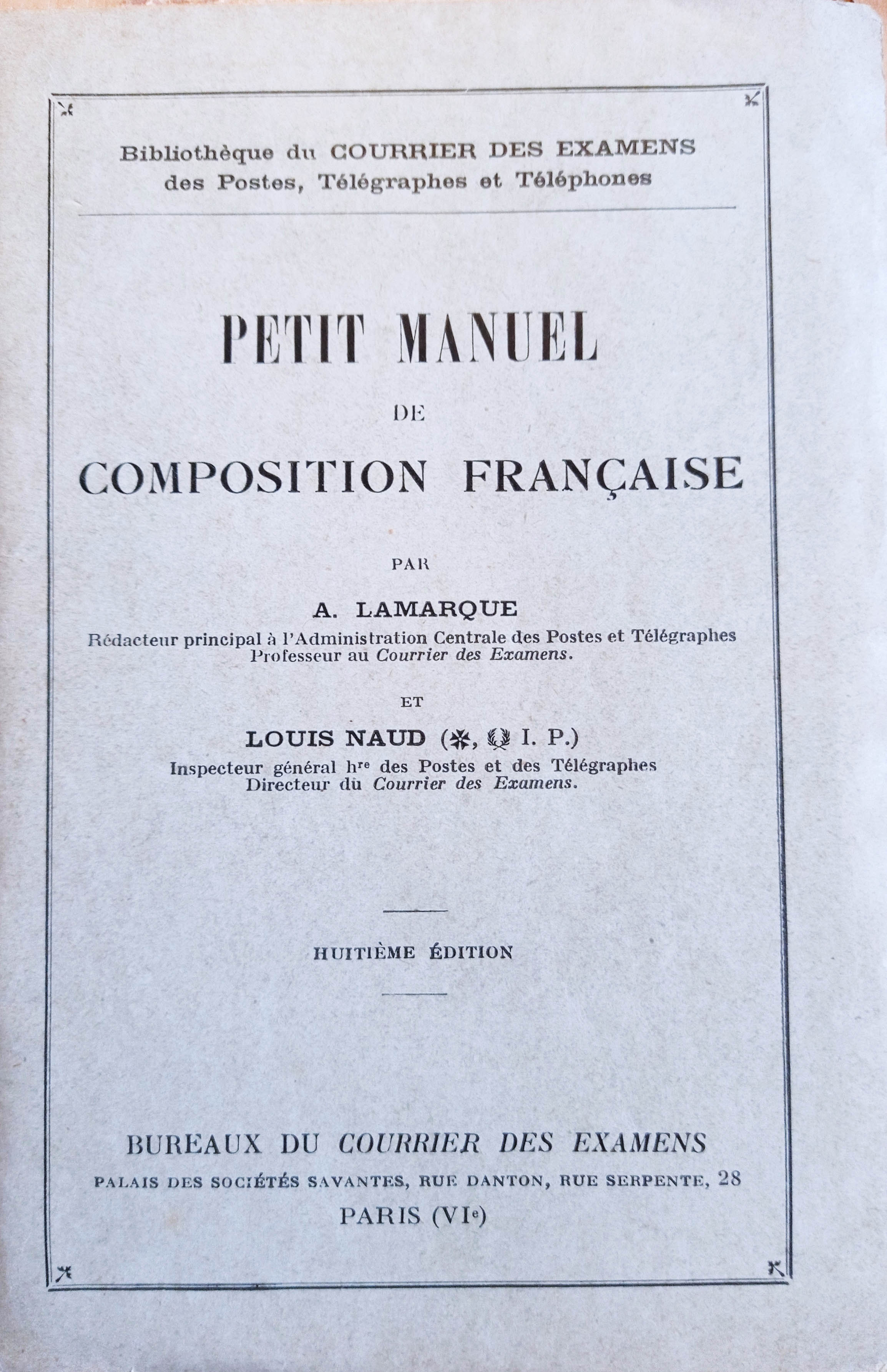LAMARQUE (A.), rédacteur principal à l'administration centrale des Poste et Télégraphes, professeur au Courrier des examens, NAUD (Louis), inspecteur général honoraire des Postes et Télégraphes, directeur du Courrier des examens., “Petit manuel de composition française,” Maison Historique de l'Ecole dans la Manche, consulté le 29 avril 2026, https://rs-genea.com/omeka/items/show/2062.