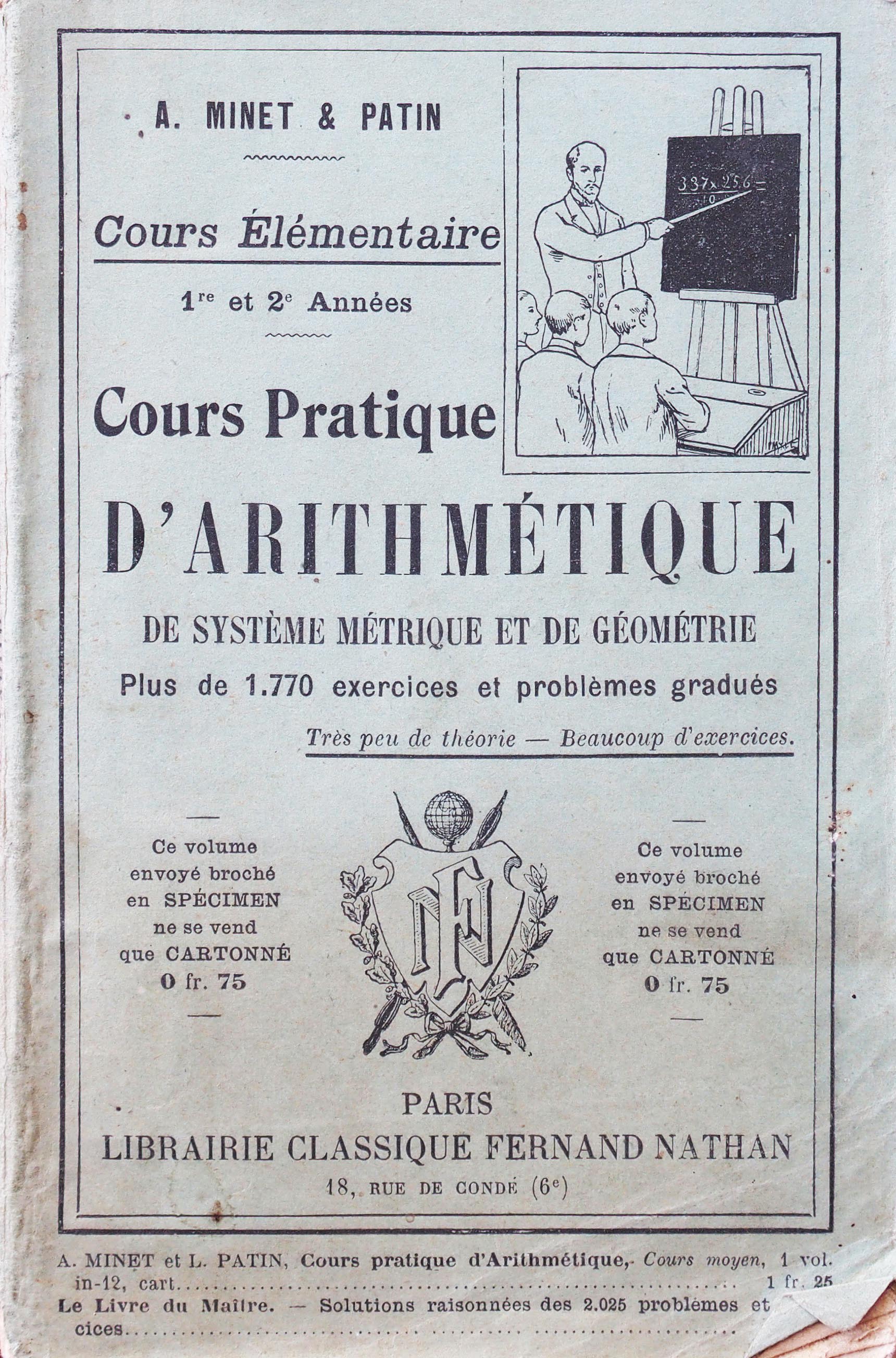 MINET (A.), inspecteur de l'enseignement primaire à Lille, PATIN (L.), directeur d'école publique à Lille, “Cours pratique d'arithmétique, de système métrique et de géométrie. Plus de 1 770 exercices et problèmes gradués. Très peu de théorie, beaucoup d'exercices.,” Maison Historique de l'Ecole dans la Manche, consulté le 28 avril 2026, https://rs-genea.com/omeka/items/show/2124.