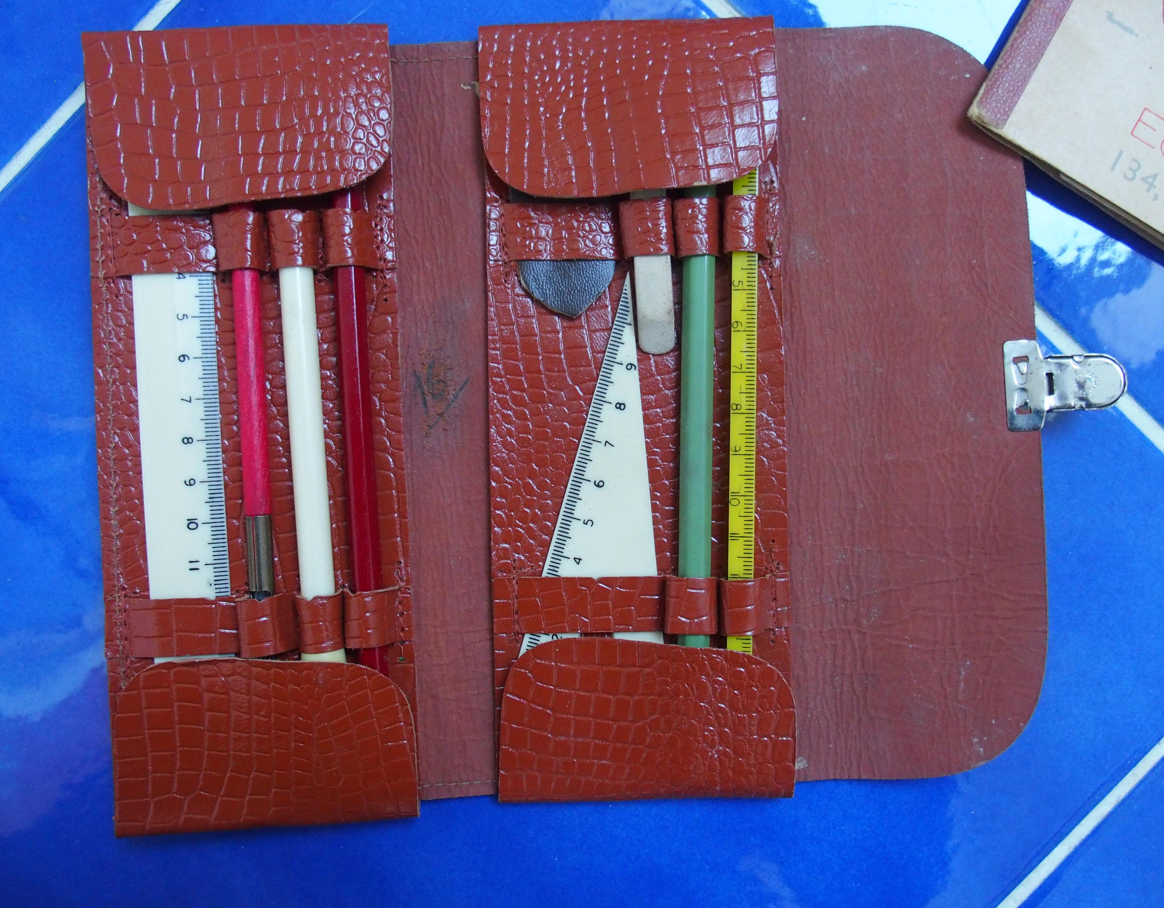 très belle trousse en excellent état comportant porte-plume, vrayons; double décimètre, équerre, règle et gomme