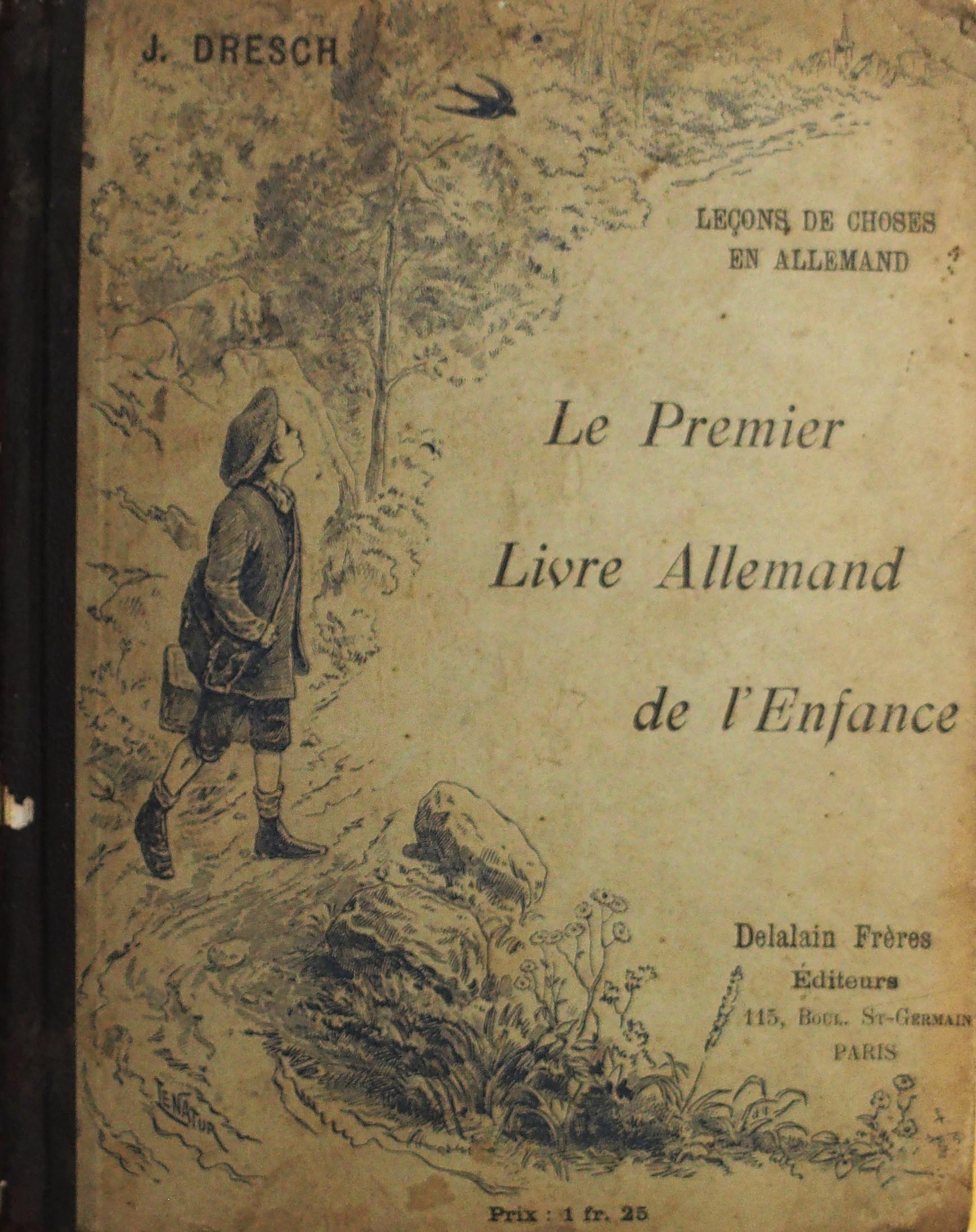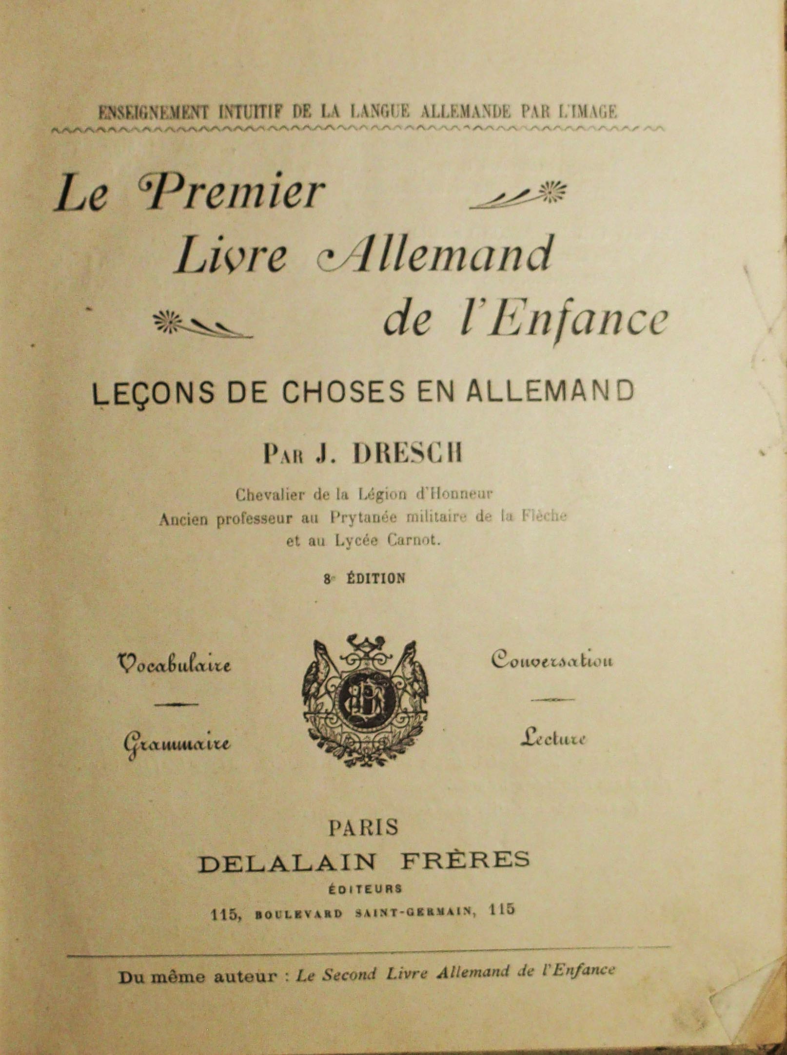 DRESCH (J.), chevalier de la Légion d'honneur, ancien professeur au Prytanée militaire de la Flèche et au lycée Carnot, “Le premier livre allemand de l'enfance. Leçons de choses en allemand. Enseignement intuitif de la langue allemande par l'image. 1909.,” Maison Historique de l'Ecole dans la Manche, consulté le 28 avril 2026, https://rs-genea.com/omeka/items/show/2199.