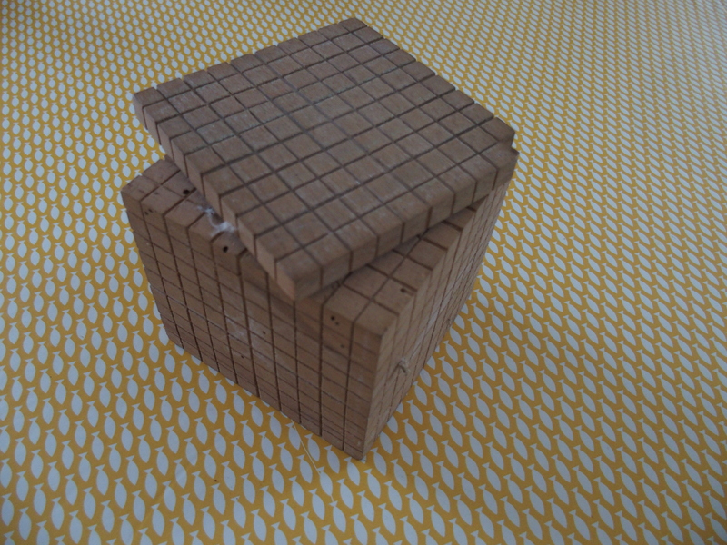 Le décimètre cube en bois est démontable. Il permet, pendant la leçon d'arithmétique, d'aborder les termes d'unité, de dizaine, de centaine et de millier ainsi que la notion de rapport.