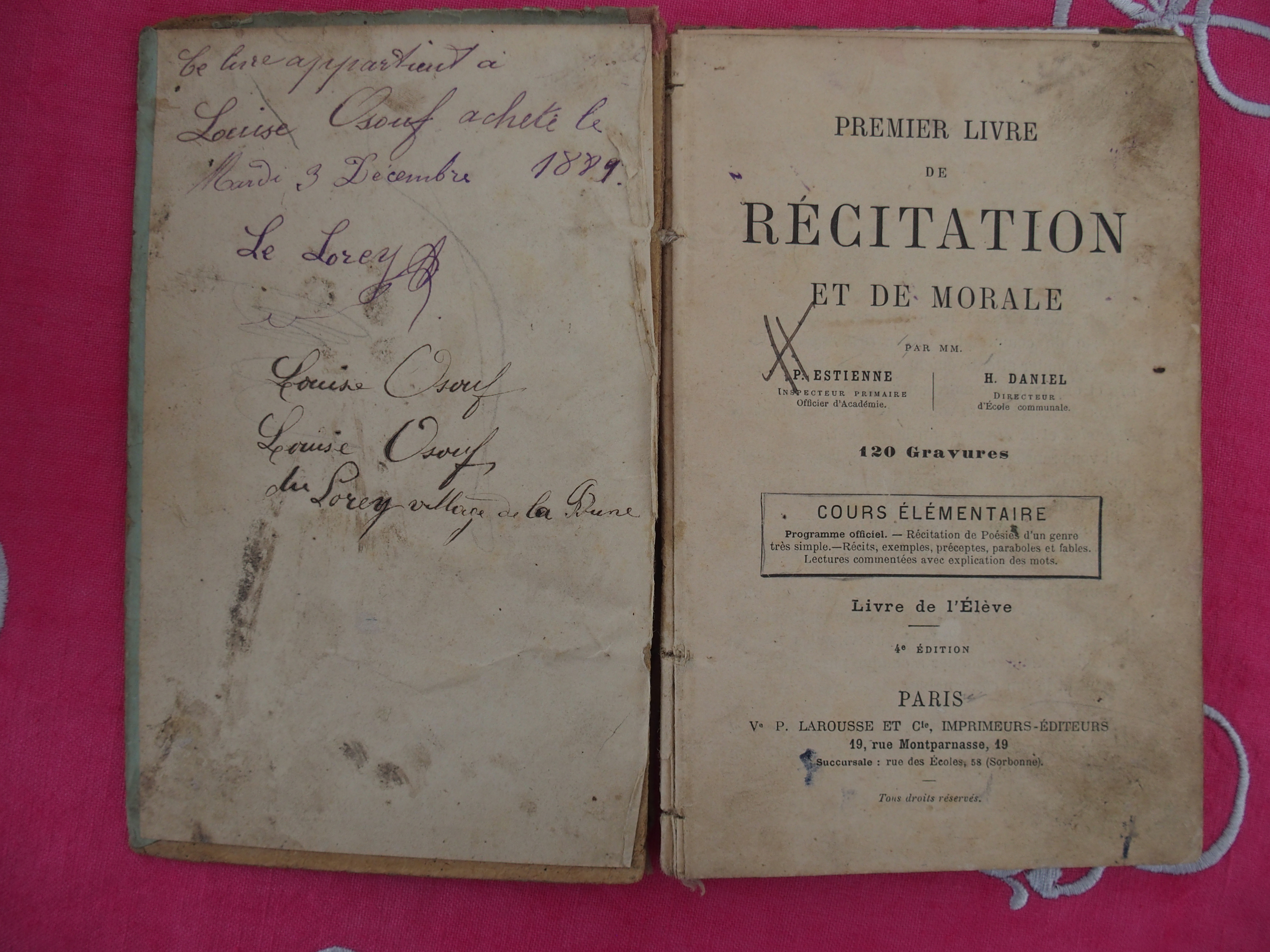 ce livre appartient à Louise Osouf, achété le mardi 3 décembre 1889. Le Lorey. Louise Osouf, du Lorey, village de la Dune