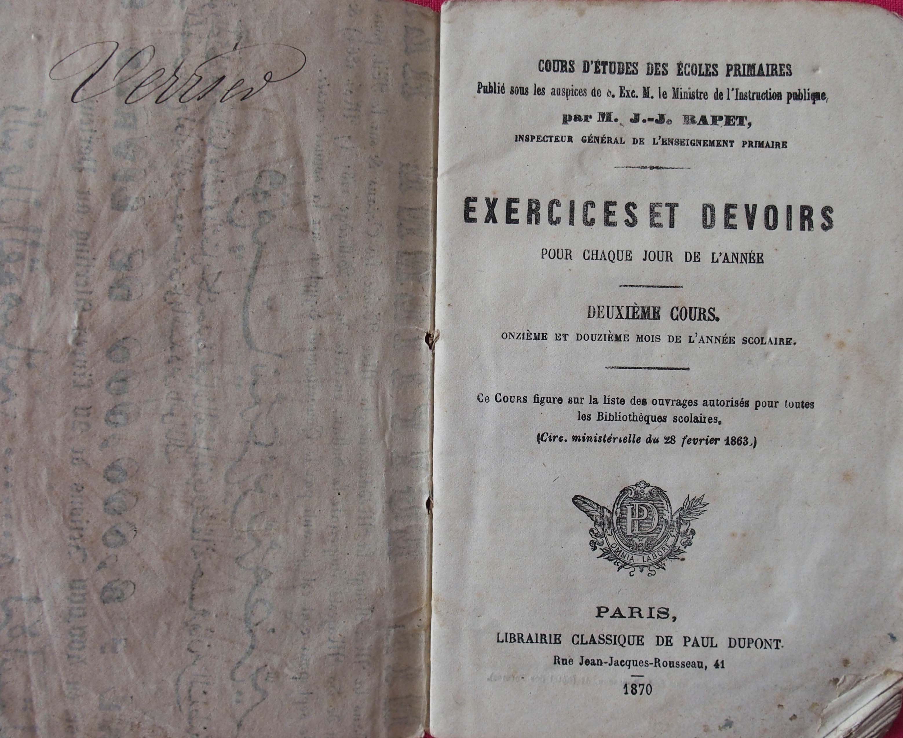 RAPET (J.-J.), inspecteur général de l'enseignement primaire, “Exercices et devoirs pour chaque jour de l'année. 1870. Cours d'études des écoles primaires publié sous les auspices de s. Excellence M. le Ministre de l'Instruction publique.,” Maison Historique de l'Ecole dans la Manche, consulté le 28 avril 2026, https://rs-genea.com/omeka/items/show/3067.