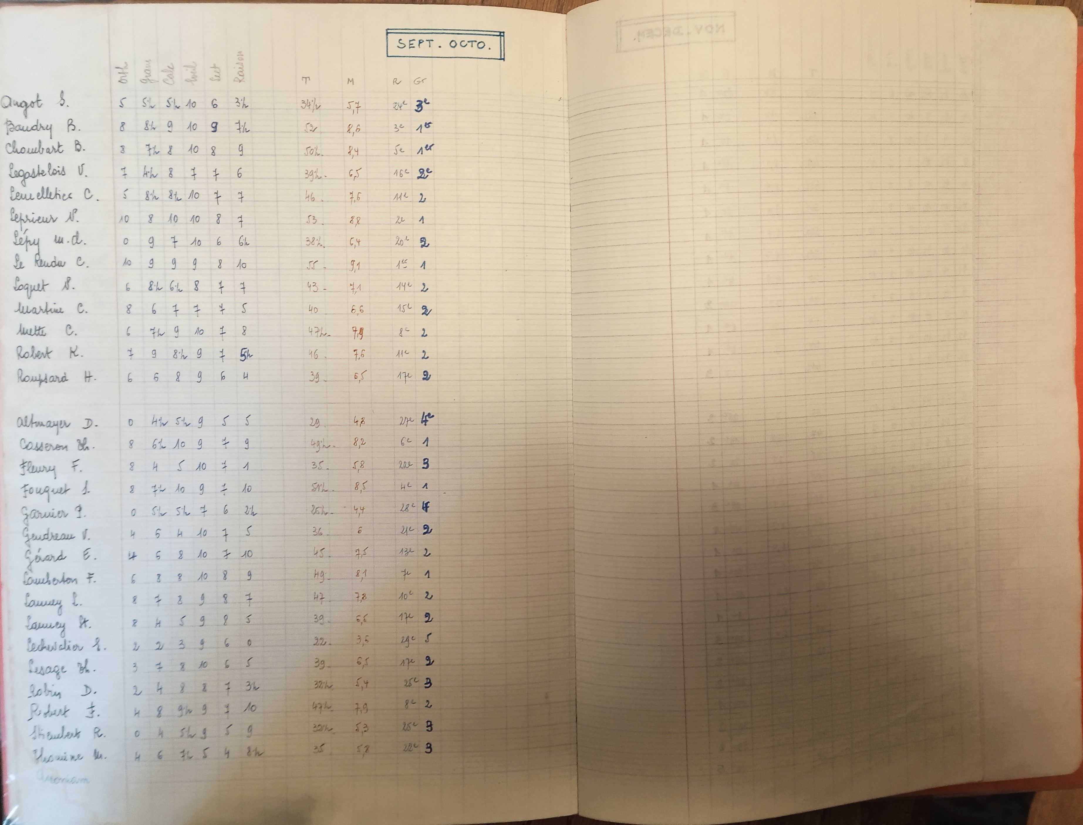 Cahier reprenant les notes et les moyennes des élèves de CE2 permettant un classement par rang et par groupe de niveau