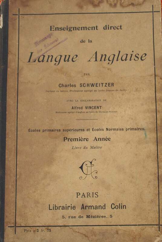 SCHWEITZER (Charles), docteur ès lettres, professeur agrégé au lycée Janson-de-Sailly, VINCENT (Alfred), professeur agrégé d'anglais au lycée de Clermont-Ferrand., “Enseignement direct de la langue anglaise. Première année, livre du maître. Tableaux d'élocution en couleur en fin d'ouvrage. EPS, EN.,” Maison Historique de l'Ecole dans la Manche, consulté le 28 avril 2026, https://rs-genea.com/omeka/items/show/3165.