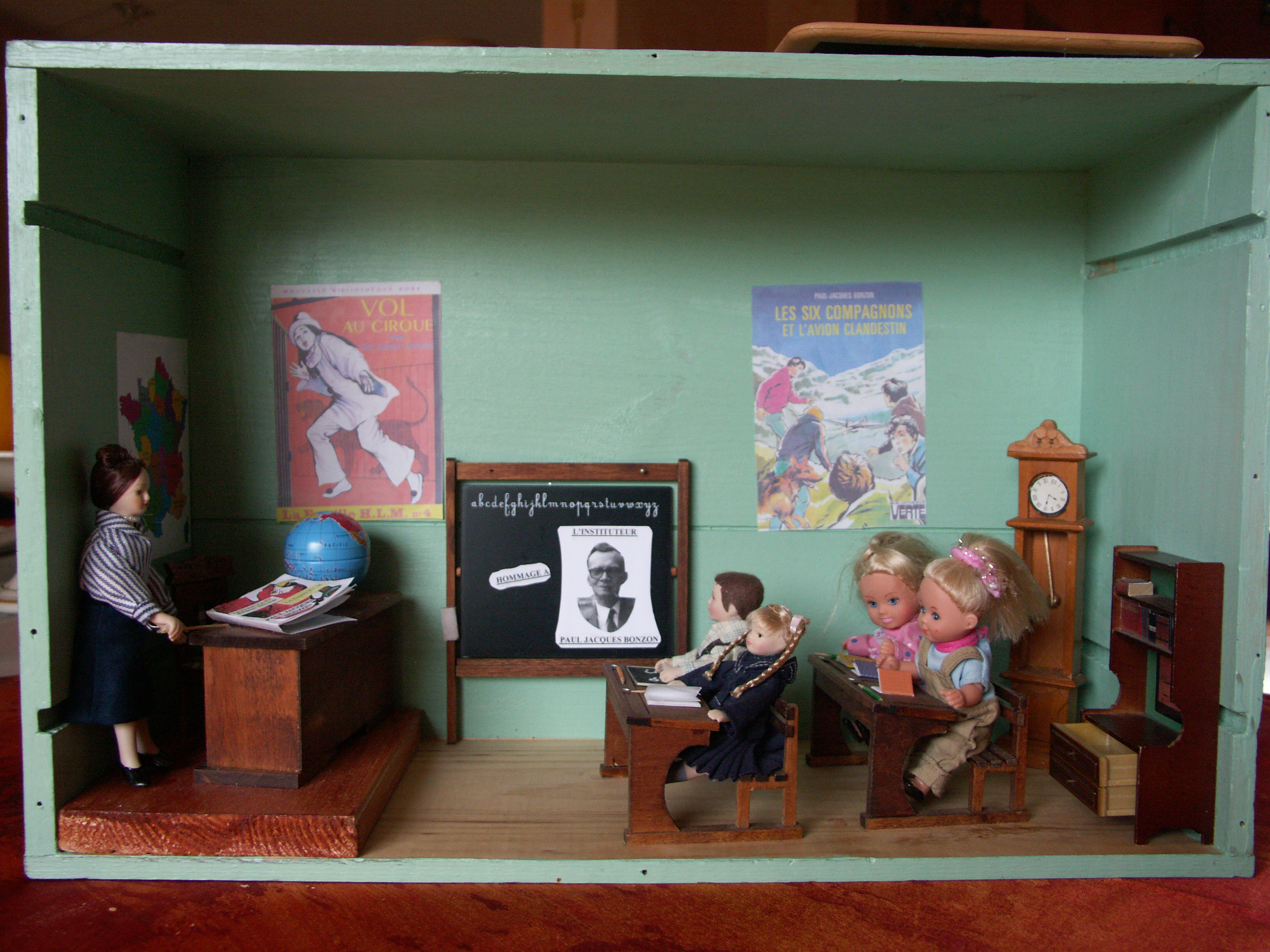 Réplique de la classe des années 1950 fréquentée par le créateur de la maquette en hommage à ses instituteurs à Saint-Laurent-en-Royans (Drôme).