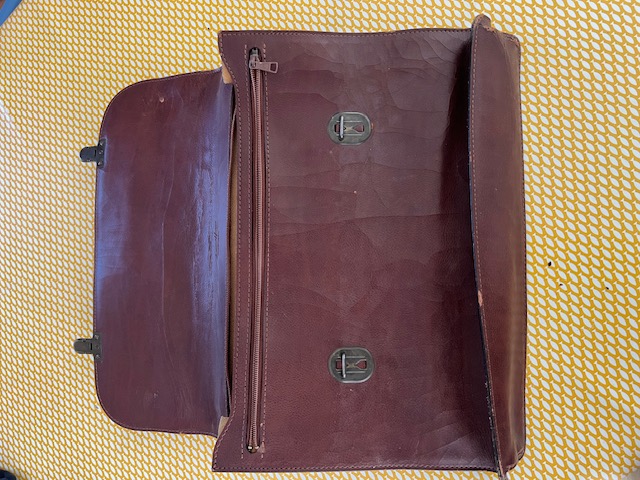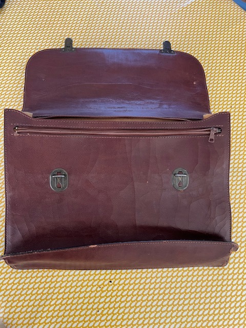 Ancien cartable d'écolier en cuir, Marque "Gérard Hénon" Paris. 40 x 30 cm. 1 compartiment + deux compartiments avec fermetures Eclair.