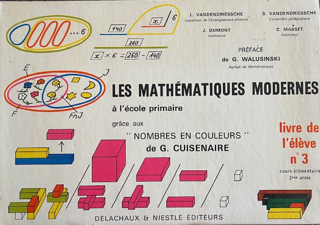 VANDENDRIESSCHE (L.), inspecteur de l'enseignement primaire, VANDENDRIESSCHE (S.), conseillère pédagogique, DUMONT (J.), institutrice, MASSET (C.), instituteur, WALUSINSKI (G.), agrégé de mathématqies, “Les mathématiques modernes à l'école primaire grâce aux "nombres en couleurs" de G. Cuisenaire. Livre de l'élève n°3. Cours élémentaire.,” Maison Historique de l'Ecole dans la Manche, consulté le 28 avril 2026, https://rs-genea.com/omeka/items/show/3495.
