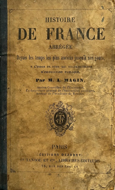 MAGIN (M. A.), ancien conseiller de l'Université, ex-inspecteur général de l'Instruction publique, recteur de l'Académie de Rennes, “Histoire de France abrégée depuis les temps les plus anciens jusqu'à nos jours à l'usage de tous les établissements d'instruction publique,” Maison Historique de l'Ecole dans la Manche, consulté le 29 avril 2026, https://rs-genea.com/omeka/items/show/3505.