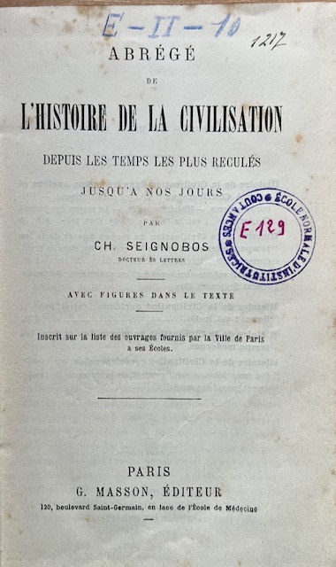 SEIGNOBOS (Ch.), docteur ès lettres, “Abrégé de l'histoire de la civilisation depuis les temps les plus reculés jusqu'aà nos jours, avec figures dans le texte.,” Maison Historique de l'Ecole dans la Manche, consulté le 28 avril 2026, https://rs-genea.com/omeka/items/show/3610.