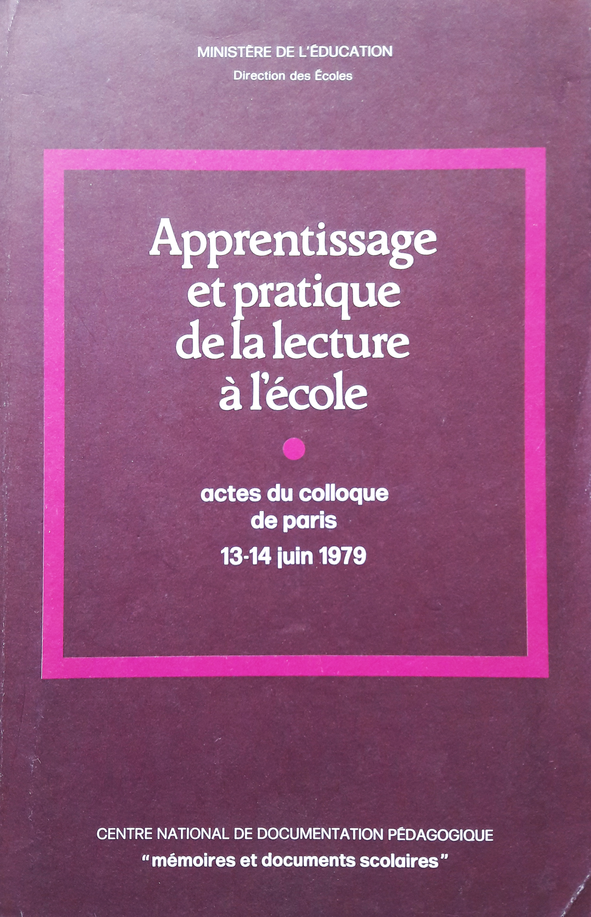 Apprentissage et pratique de la lecture à l'école. Actes du colloque de Paris. 13-14 juin 1979.