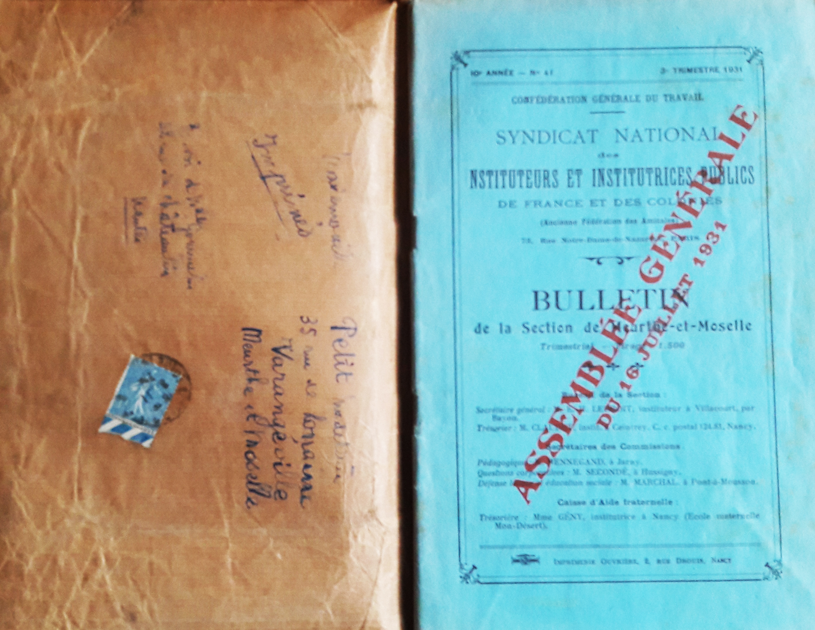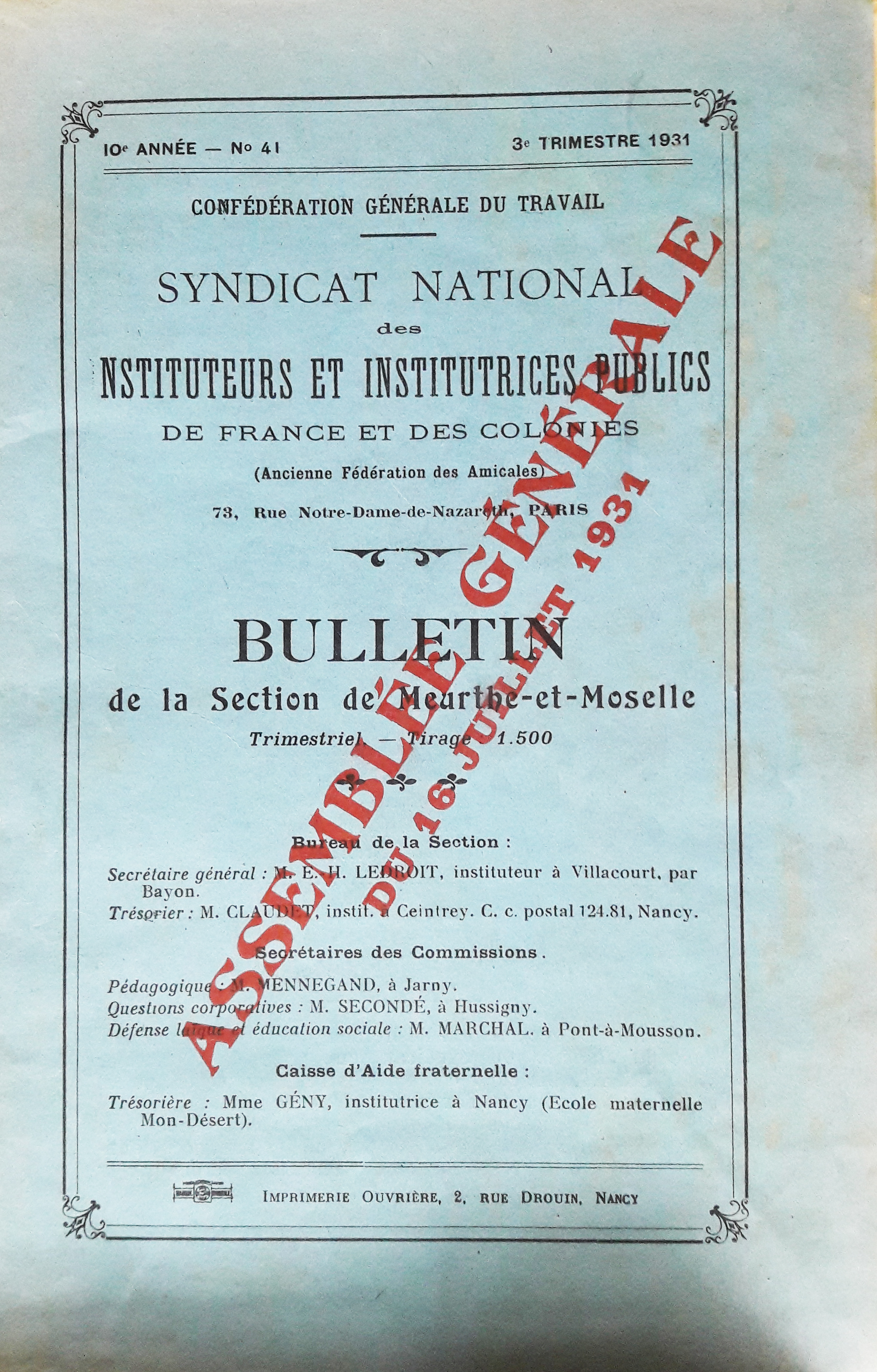 Syndicat national des instituteur et institutrices publics de France et des colonies. Bulletin de la section de Meurthe et Moselle. Confédération générale du travail. 10e année. N° 41. 3e trimestre 1931.