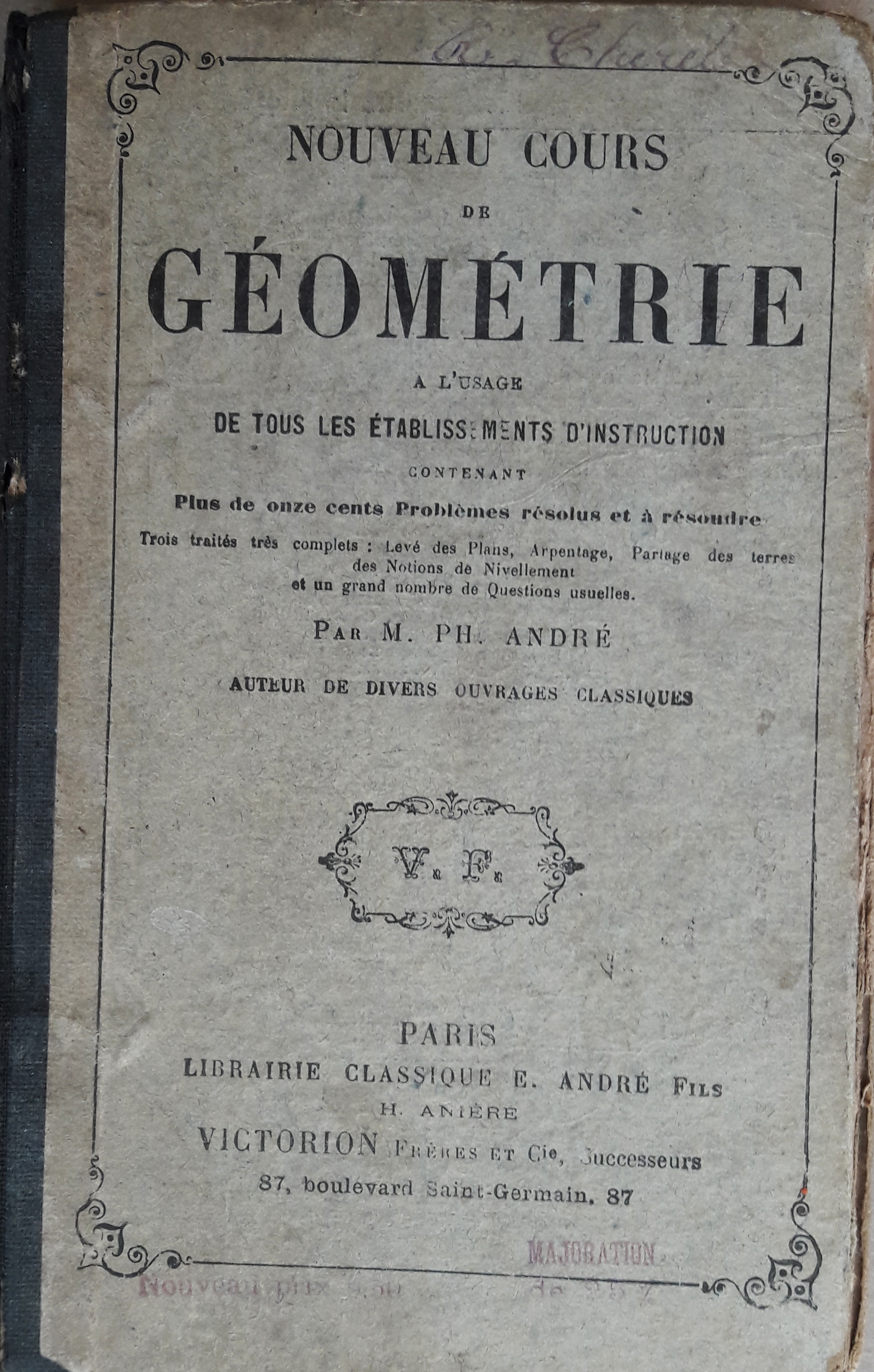 contenant plus de onze cent problèmes résolus et à résoudre. trois traité très complets : levé de plans, arpentage, partage des terres, des notions de nivellement et un grand nombre de questions usuelles.